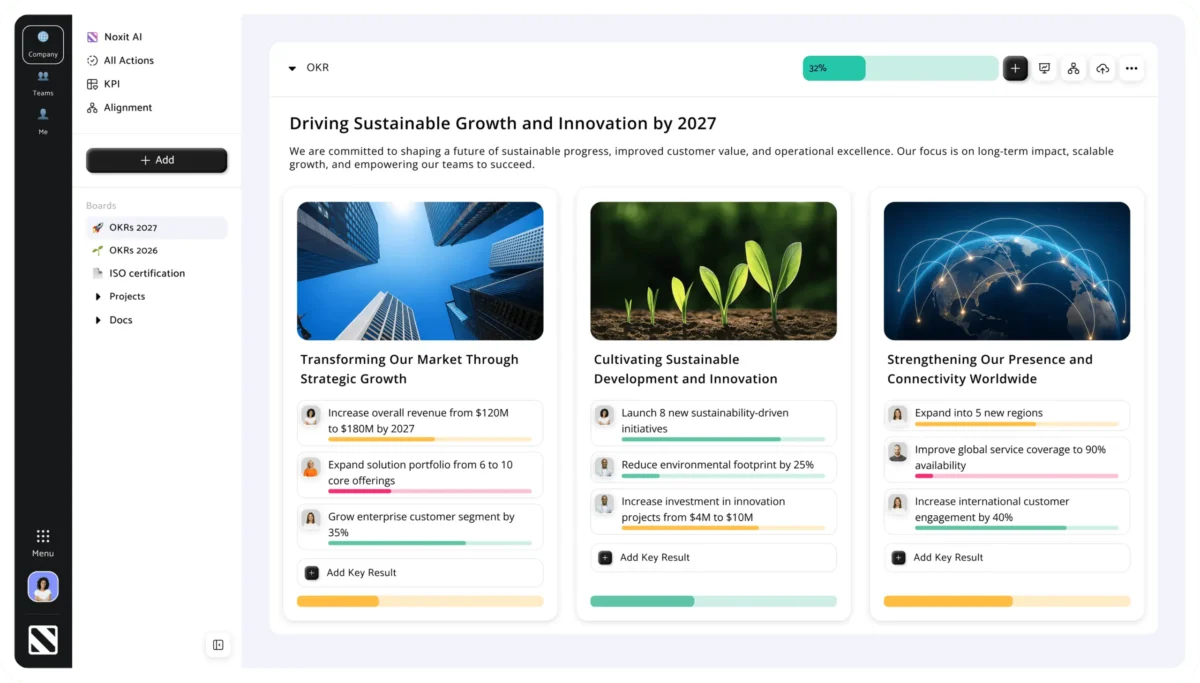 With Noxit, our goal management became both transparent and scalable. Teams can now work in a unified way with a shared understanding of their goals. Regular follow-ups have helped increase engagement and improve goal achievement.