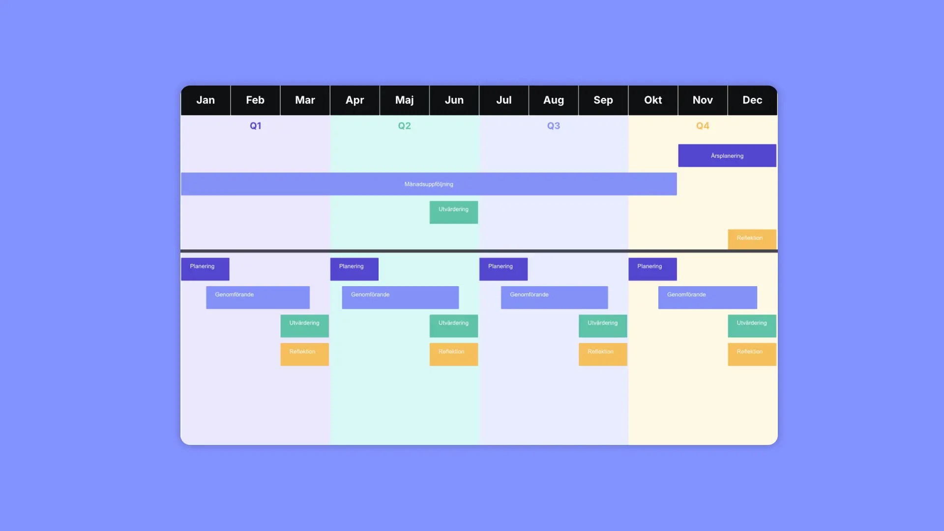 Mallen är byggd som ett PowerPoint-ramverk ni kan använda direkt eller anpassa. Den täcker hela cykeln — årsplanering, månadsuppföljning, halvårsutvärdering och årsreflektion på organisationsnivå, plus kvartalskick-off, löpande check-ins och kvartalsutvärdering på teamnivå.